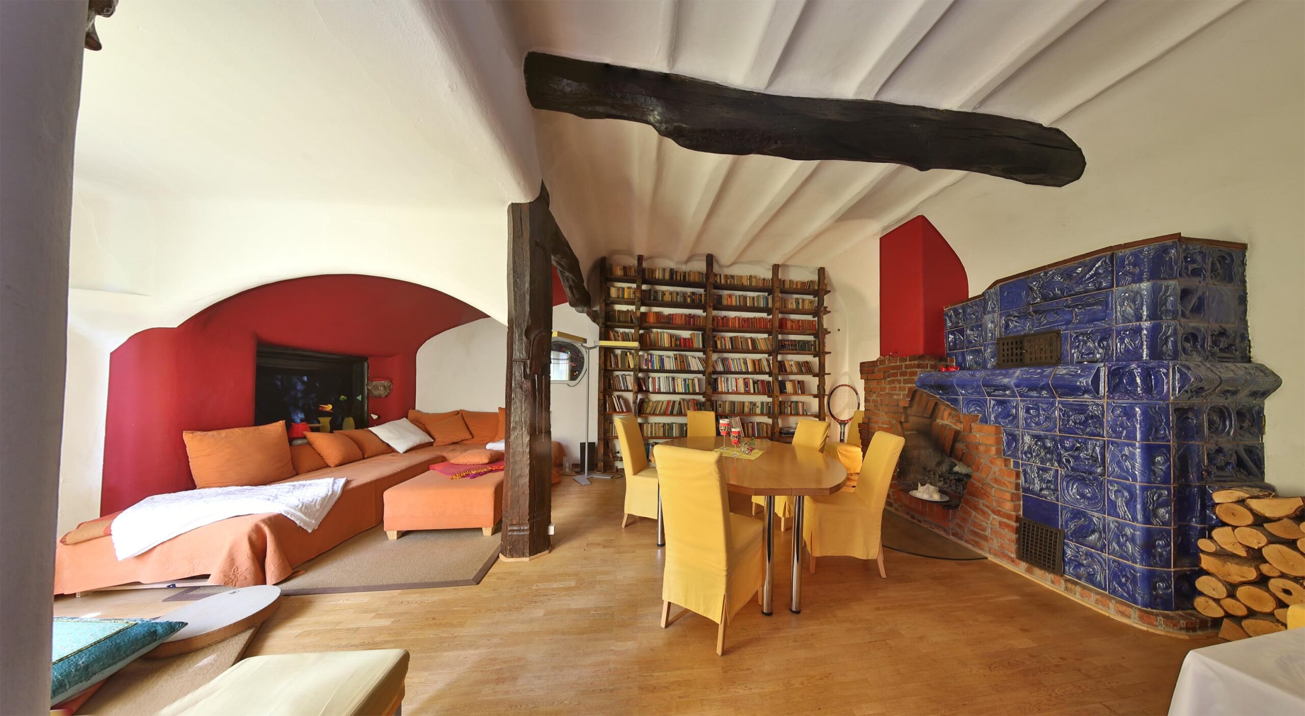 Türreliefs, Deckenmalereien, Bäume im Treppenhaus: Verschiedenste original erhaltene Gestaltungselemente beleben den Charakter des Wohnhauses. Das expressionistische Kulturdenkmal kommt überwiegend ohne rechte Winkel aus und vermeidet jede Symmetrie.